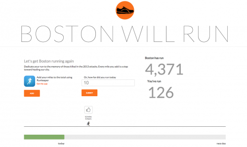 General Description Boston Will Run is a single-page site that lets users share their progress in training for the 2014 Boston Marathon, and collectively see the progress all participants are making in training for the Boston Marathon. The site is meant to be simple and direct, with just a few key elements shown: Total miles all participants have run, how many the individual has run, and a little graphic indicating who has run that day.