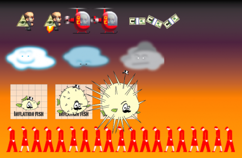Inflation is a banker/puffer-fish with a nod to the monopoly man.